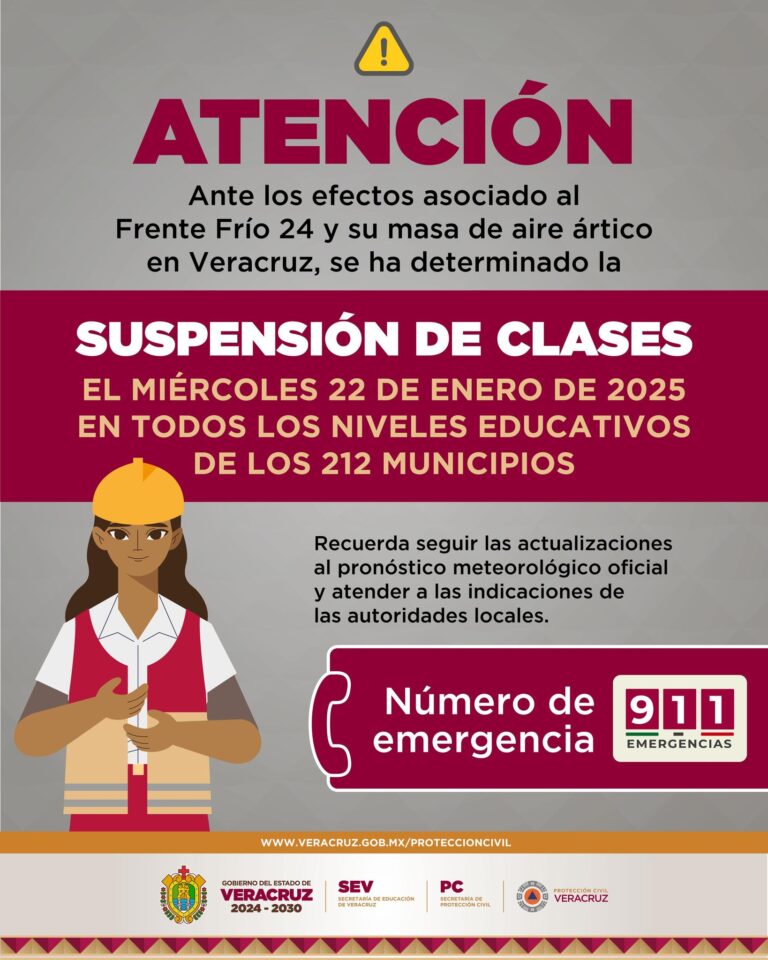 Mañana miércoles 22 de enero, no hay clases de acuerdo a lo establecido por la secretaria de protección civil del estado de Veracruz.